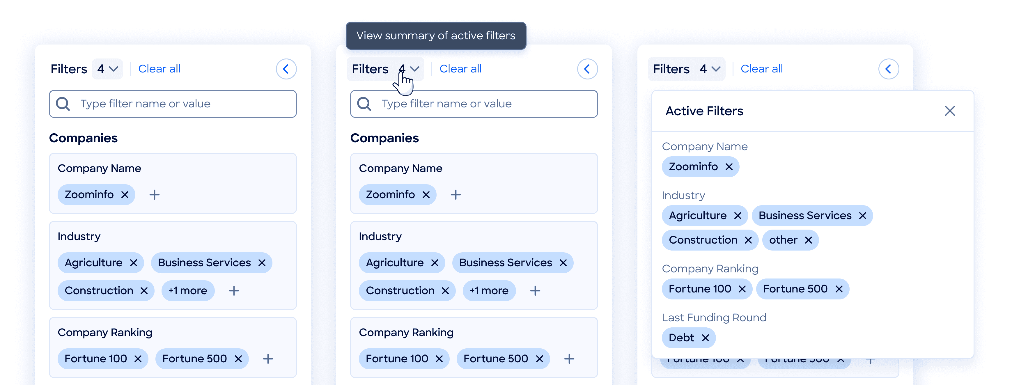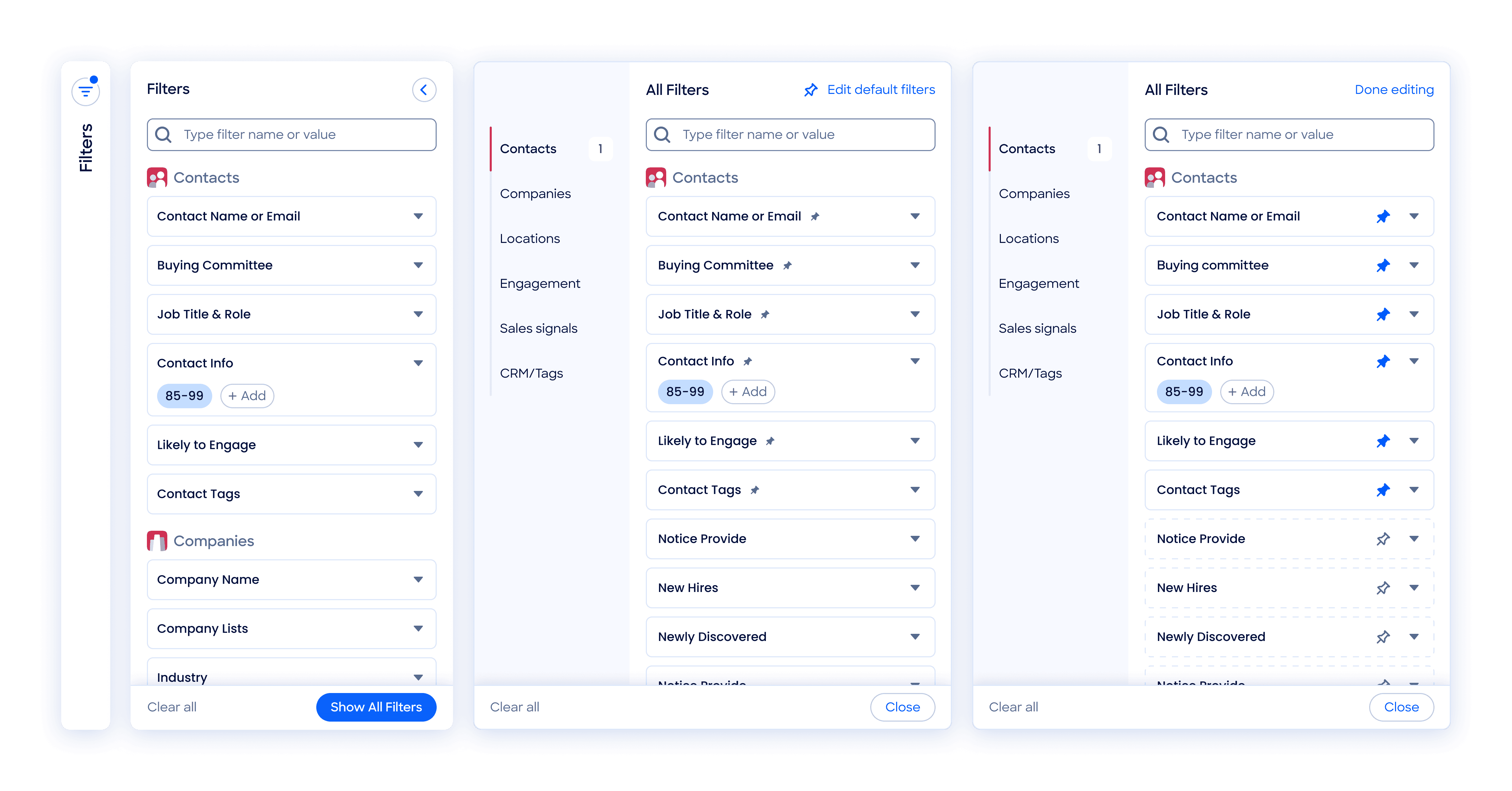 Filter Panel Refinement #1 (L→R: Collapsed → Default → Expanded)