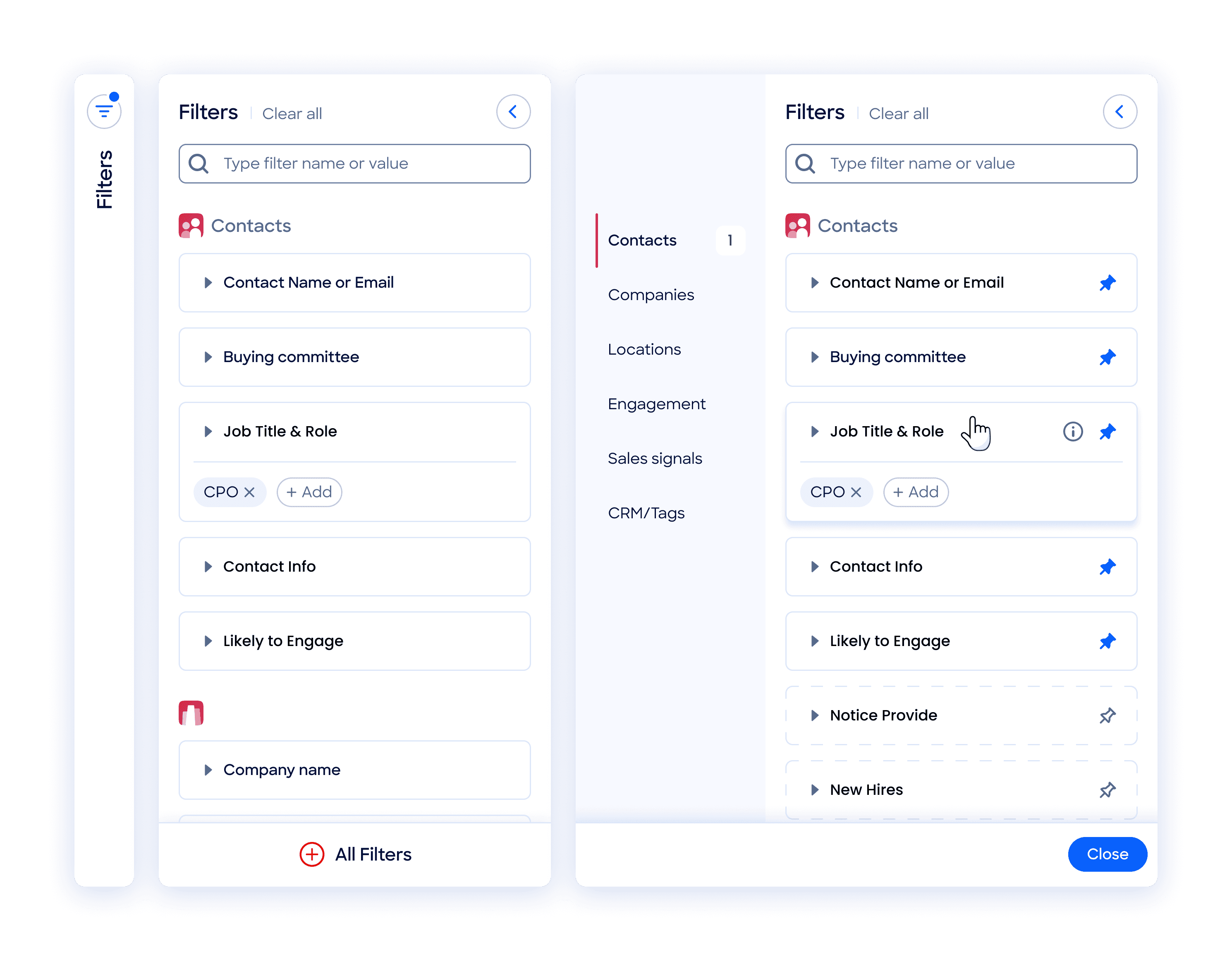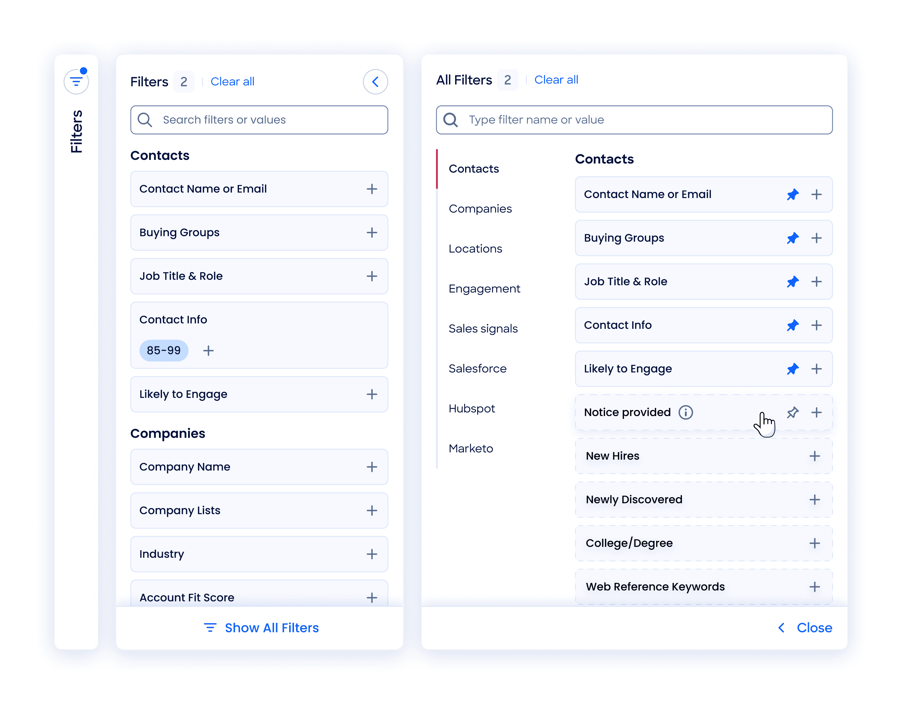 To support different workflows, we introduced the ability to pin filters. Users could choose the filters they used most from an expanded filter panel view to keep them visible in the default view. This gave people more control over their workspace without requiring any complex settings.
