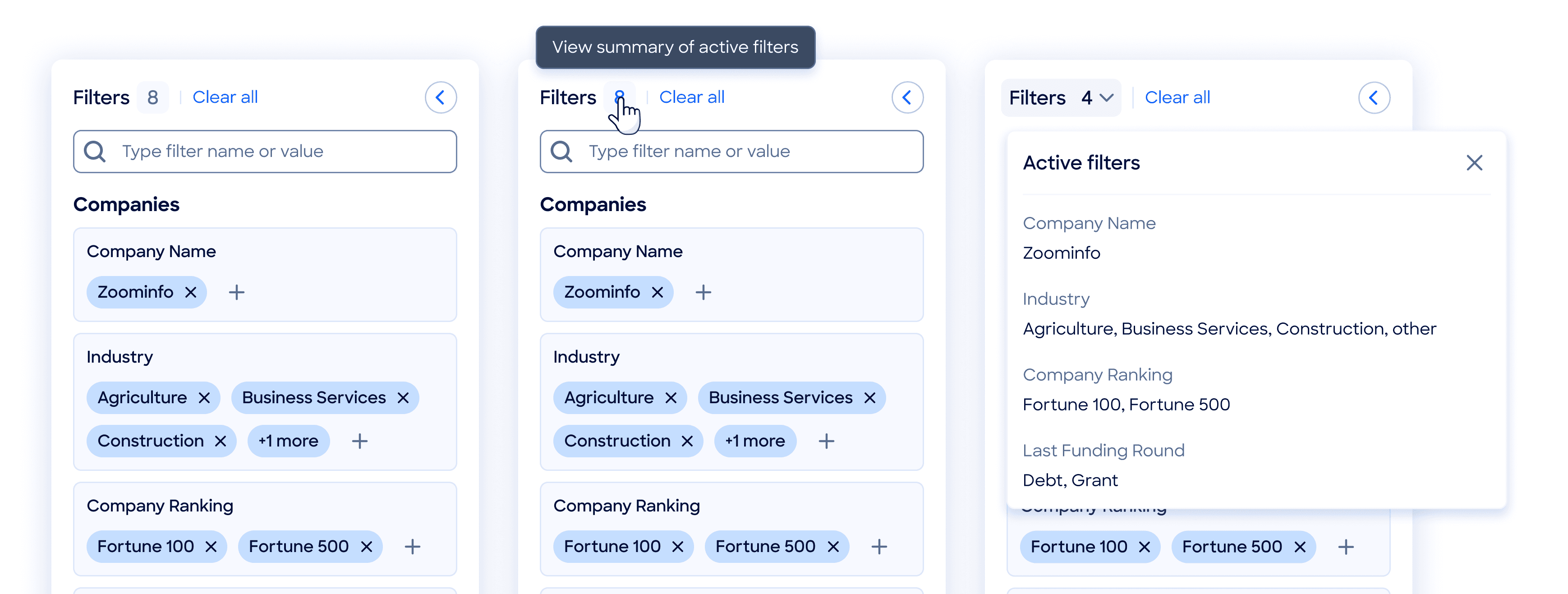 During the beta release, early users noted that the filter panel lacked a quick way to check which filters were currently active. To address this, I designed a filter summary directly in the panel header.