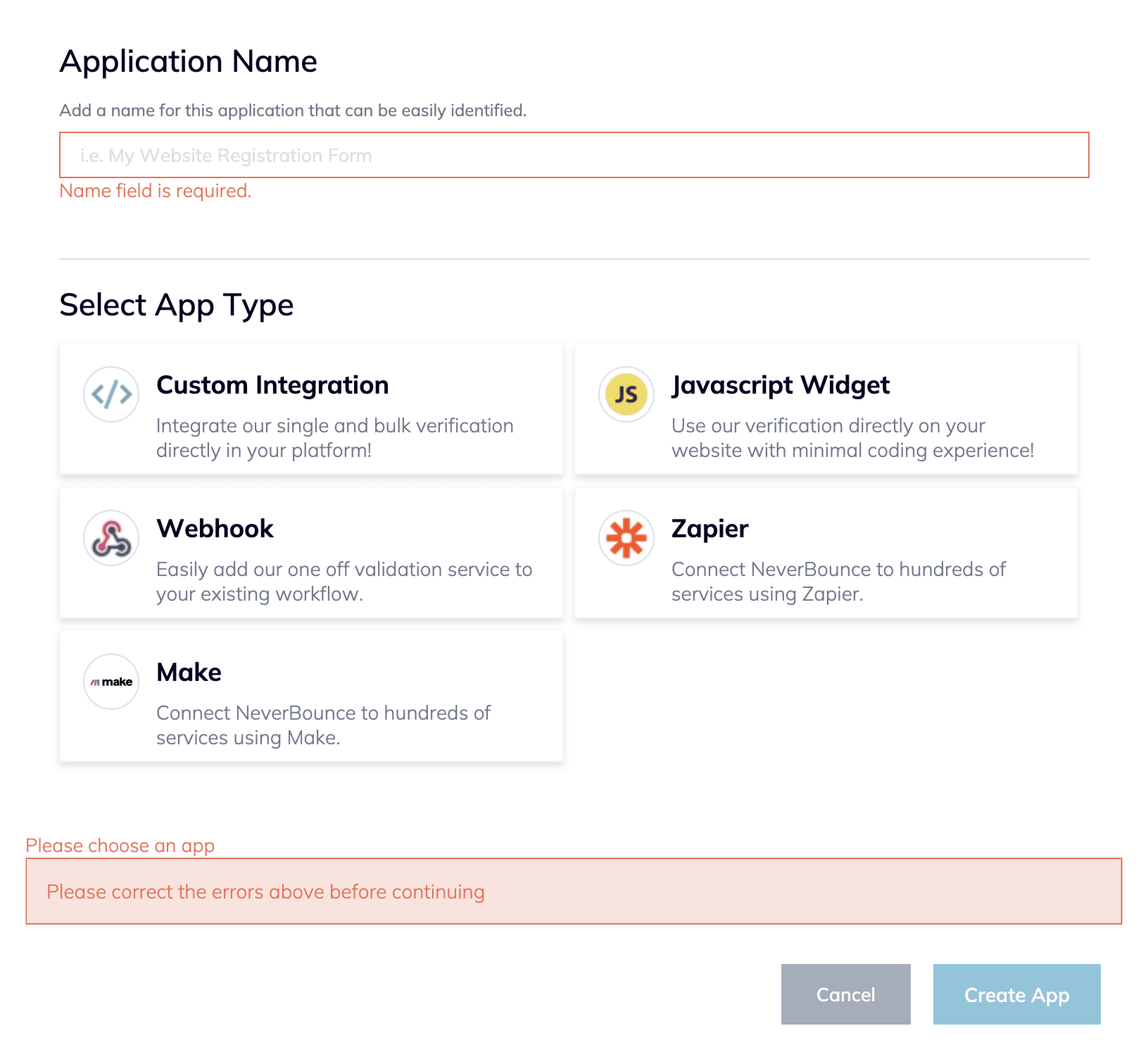 Creating a new integration opened a modal where users chose a type and entered a name. Most clicked “Create App” without naming it, triggering errors and repeated drop-off.